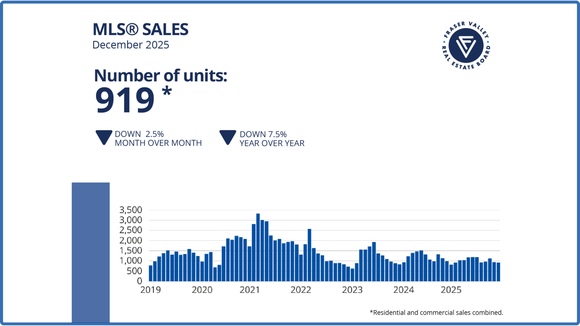 The Board recorded 919 sales on its MLS® in December, a decline of 2.5 per cent from November, and 7.5 per cent below sales from December 2024.