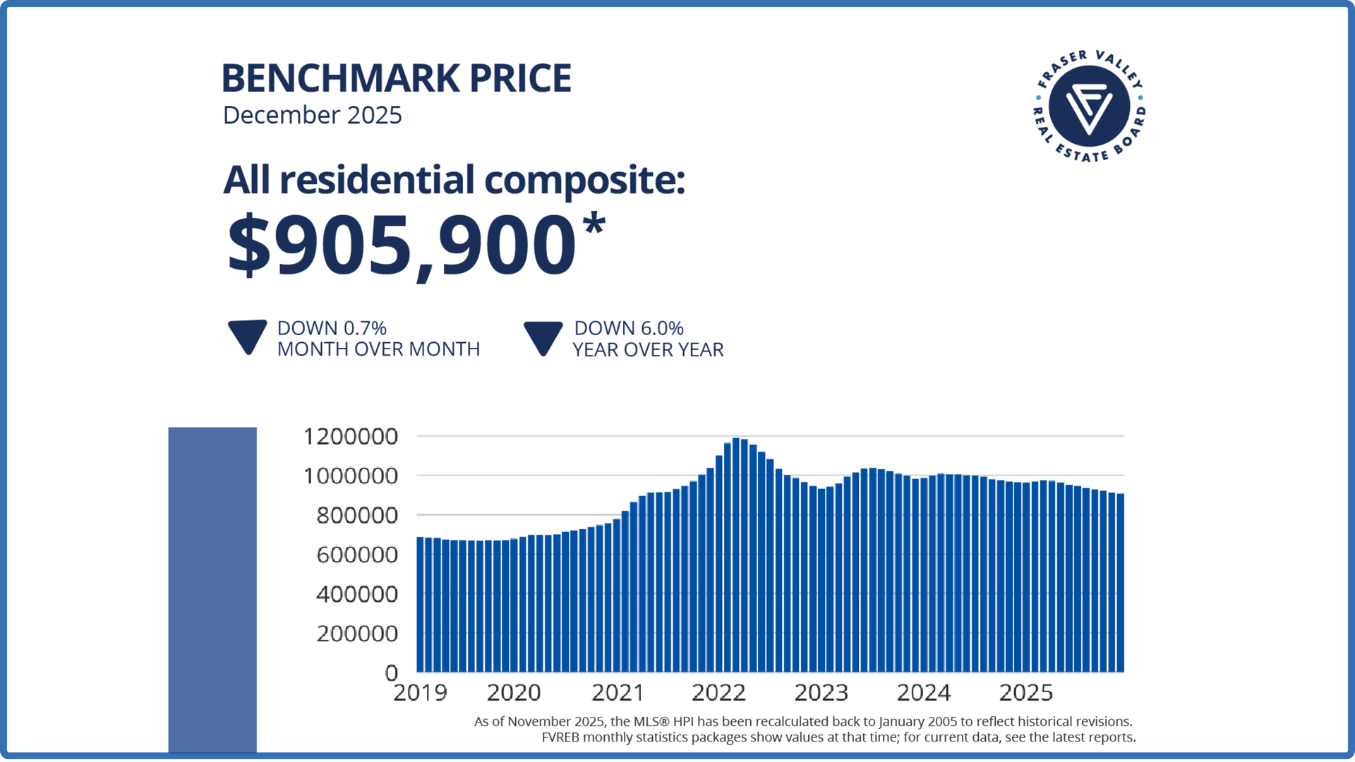 The composite Benchmark home price in the Fraser Valley closed the year at $905,900, down six per cent year-over-year, and down 24 per cent from the peak in March 2022.