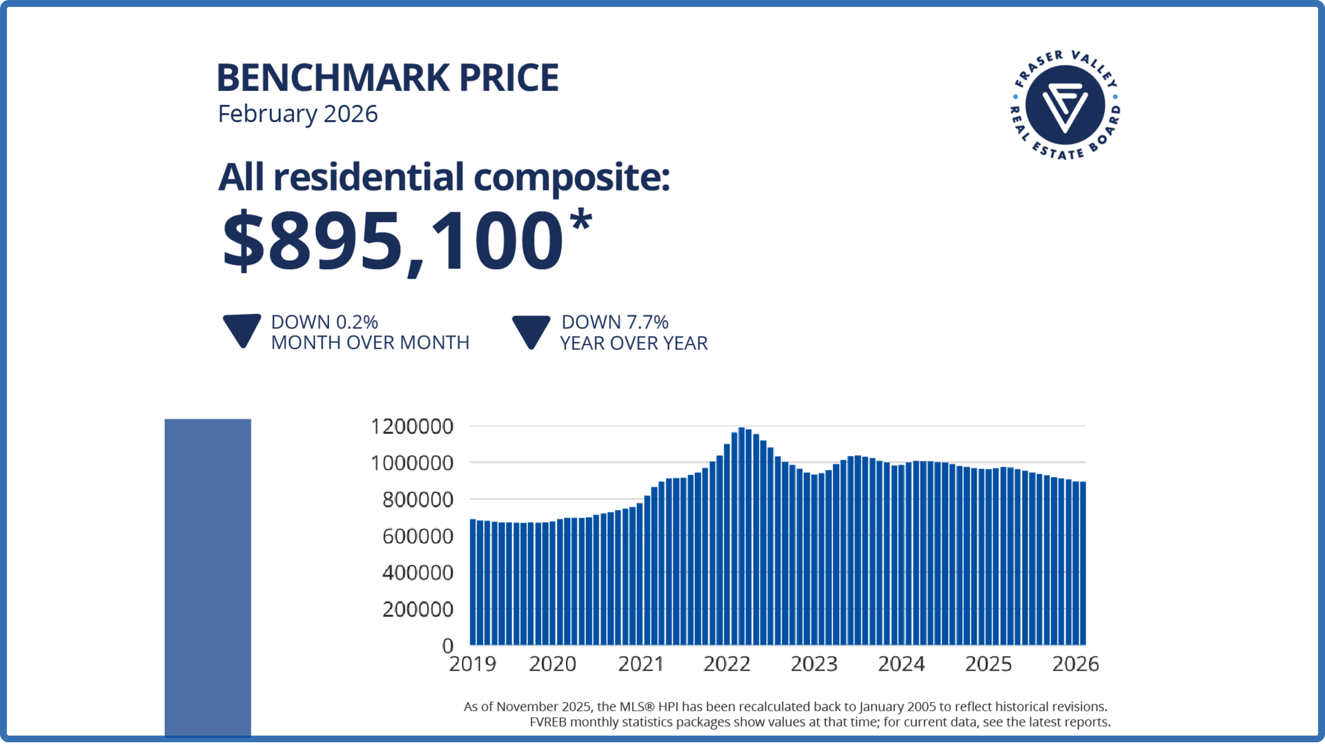 The composite Benchmark price for a typical home in the Fraser Valley decreased 0.2 per cent in February, to $895,100.