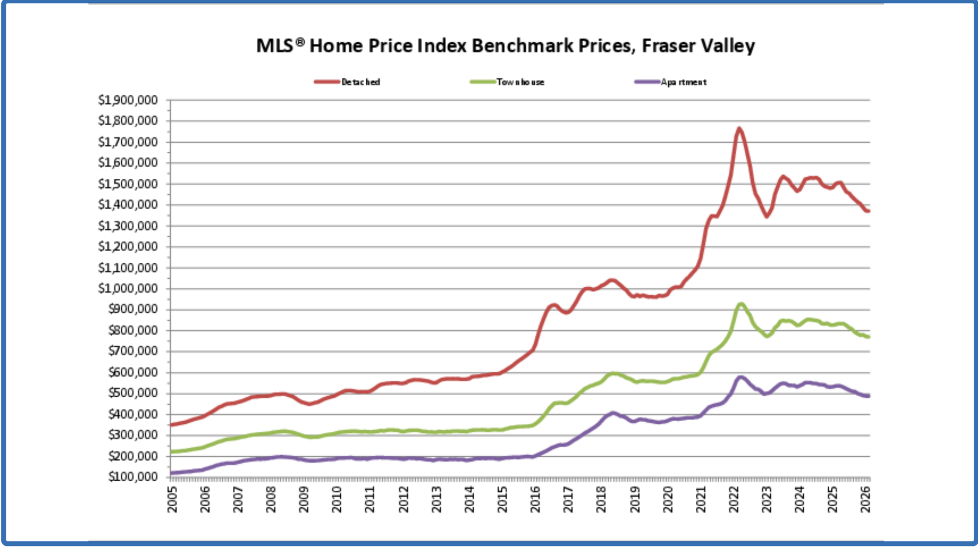 - Townhomes: At $770,700 the Benchmark price for an FVREB townhome decreased 0.3 per cent compared to January 2026 and decreased 7.1 per cent compared to February 2025.