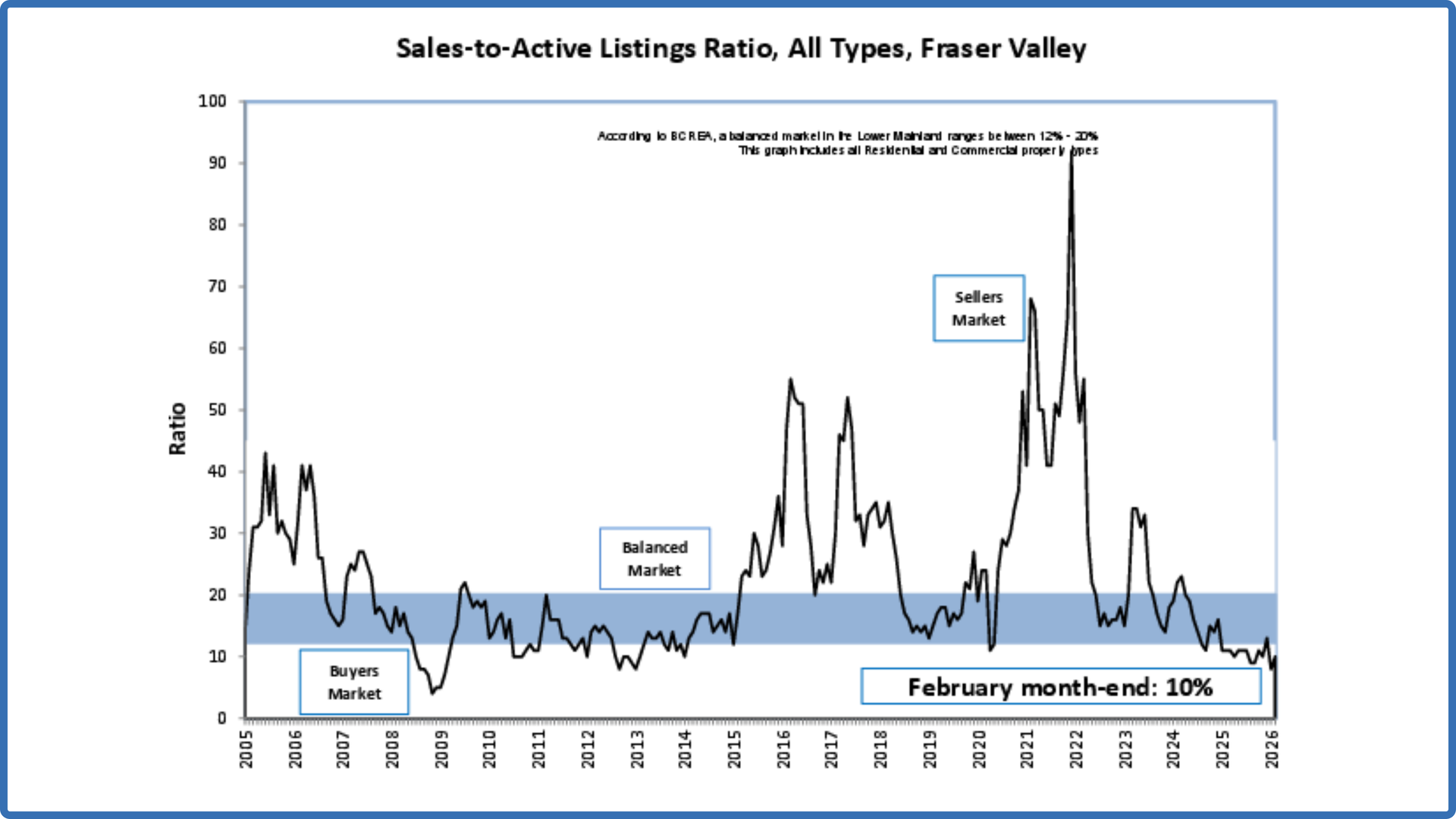The Fraser Valley remains firmly in a buyer’s market, with an overall sales-to-active listings ratio of ten per cent in February. A balanced market is typically defined by a ratio between 12 and 20 per cent.
