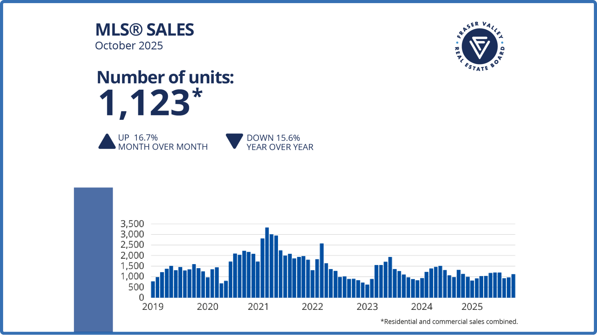 The Fraser Valley Real Estate Board recorded 1,123 sales on its Multiple Listing Service® (MLS®) in October, a 17 per cent increase from September, but 16 per cent below sales from the same month last year.